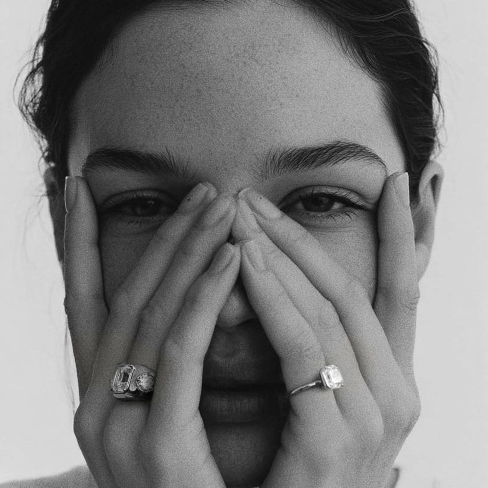 Geometry meets glamour. A 2.7ct diamond equivalent Asscher cut, all precision and light-play, framed by fluid silver. Worn on the pinky, it’s a modern classic in the making.